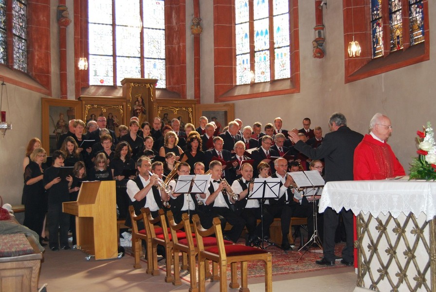 Paukenschläge zu Beginn des Gloria und des Sanctus und Fanfarenklänge füllten das Gotteshaus. Organist und Dekanatskantor Alfons Müller pflegt ein liebenswertes Dirigat und sein Schwung springt über